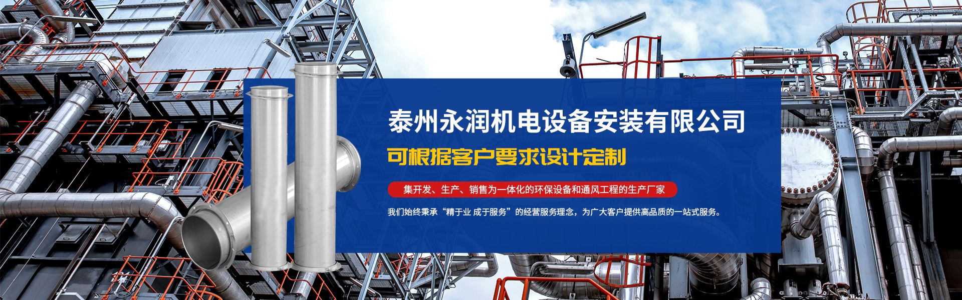 泰州永潤(rùn)機(jī)電設(shè)備安裝有限公司是一家從事不銹鋼風(fēng)管、螺旋風(fēng)管、碳鋼風(fēng)管、PP風(fēng)管、共板法蘭風(fēng)管、角鋼法蘭風(fēng)管及環(huán)保設(shè)備和通風(fēng)工程的生產(chǎn)廠家,提供為建筑智能化工程、暖通工程、安防工程、人防工程、消防工程、環(huán)保工程、機(jī)電工程、建筑裝飾裝修工程的設(shè)計(jì)與施工,公司產(chǎn)品可根據(jù)客戶要求設(shè)計(jì)定制,歡迎各界朋友蒞臨參觀、指導(dǎo)和業(yè)務(wù)洽談。公司成立于2018年,坐落于梅蘭芳故里——鳳城泰州,城市周邊交通網(wǎng)絡(luò)發(fā)達(dá),運(yùn)輸方......
